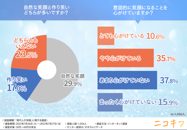 そこで今回、笑顔で貯めたポイントが寄付できる笑顔アプリ『ニコキフ』(https://nicokifu.jp/)を運営する株式会社EQ(https://eq1990.com/)は、20代~60代の男女を対象に「現代人の笑顔」に関する調査を実施しました。