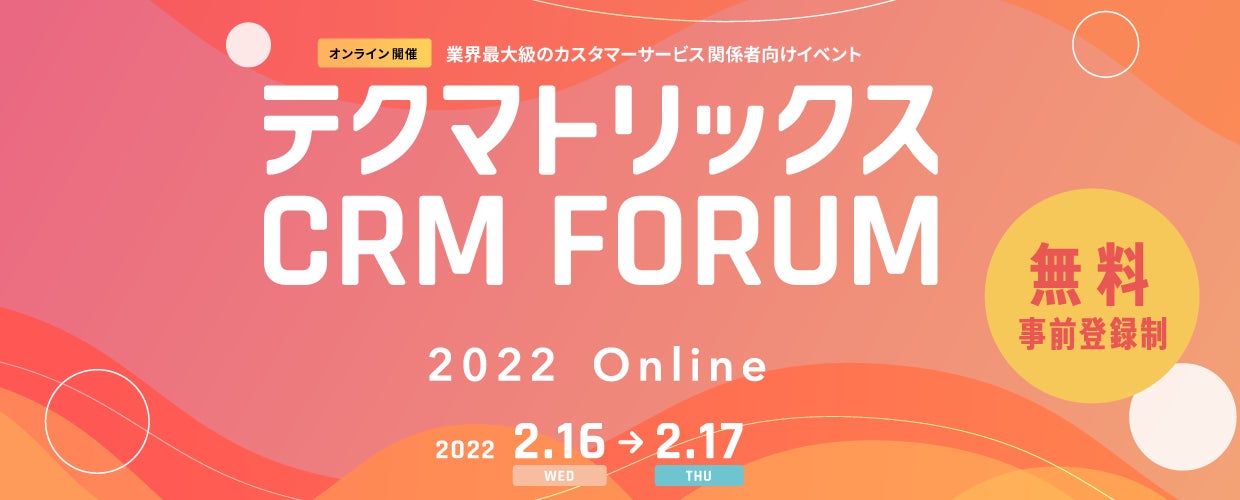 テクマトリックス株式会社 (本社:東京都港区、代表取締役社長:由利孝、以下「テクマトリックス」) は、カスタマーサービスの業界動向や最新ソリューション、導入事例を紹介する日本最大級のカスタマーサービス関係者向けイベント「テクマトリックスCRM FORUM 2022 ~ヒト×テクノロジーで次の未来へ~」を、2022年2月16日(水)・17日(木)の2日間、オンラインで開催します。