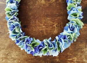 ハワイ語ではポーポーハウと呼ばれるアジサイ。この季節にぜひ作ってみていただきたいレイのひとつです。TIリーフを三つ編みしながらお花を編みこむHAKUスタイルです。