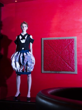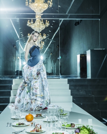 生地一面にプリントされた料理は、世界的に有名なイタリアの建築家アルド・ロッシが手がけた日本初のデザイナーズホテル「ホテル イル・パラッツォ」(http://www.ilpalazzo.jp)の総料理長である村上シェフが担当。フランス料理のシェフに授けられる栄誉称号、日本エスコフィエ協会のディシプルを授与した村上シェフの華やかで洗練された品々と、Quantizeの軸であるオートクチュールを生かした上質なモードが出会い、見ても着てもおいしい甘美なドレスが生まれました。