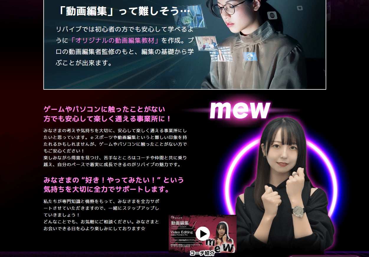 リバイブでは、eスポーツと動画編集を通じて利用者の自己表現力を向上させ、自信を持って社会に参加できるようサポートします。