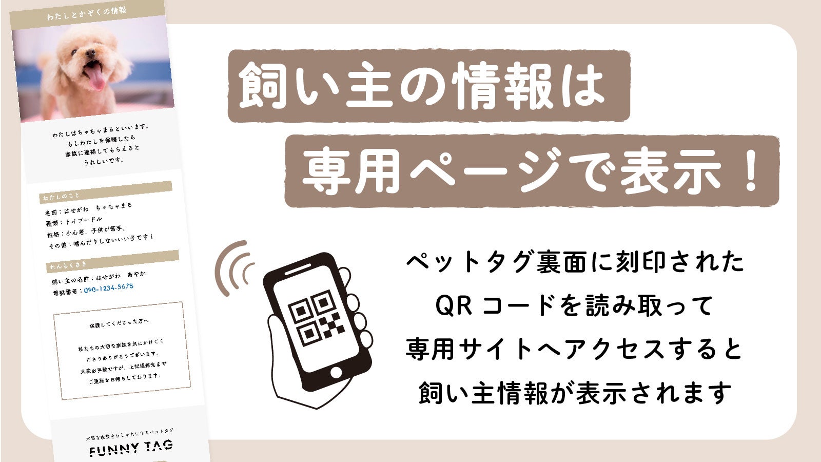 Funny tagは飼い主の個人情報を専用サイトに登録。裏面にレーザー刻印した二次元バーコードを読み込むと表示され、迷子の際は飼い主に直接連絡することが出来ます。