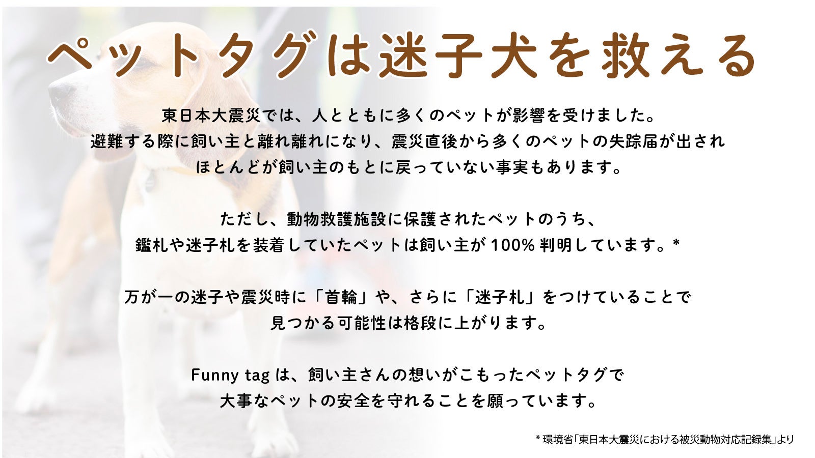 Funny tagはオシャレなペットタグで飼い主様と大切なペットを万が一の際も守れるように、愛情を込めてお届けします。