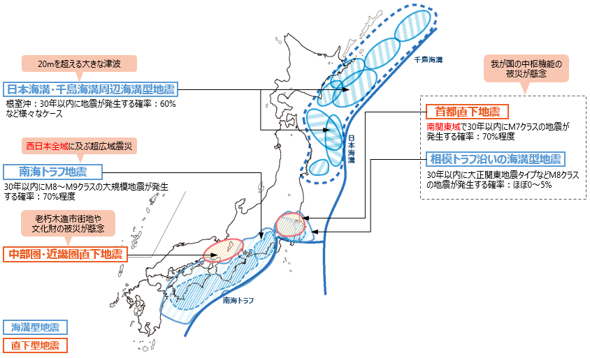 今後発生すると言われている首都直下型地震、南海トラフ巨大地震は30年以内に70%の確率で起こると想定されています。