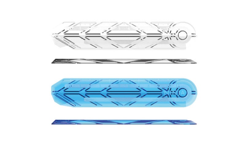 TPOに配慮したクリアとブルーの2色展開で、教育現場でも安心して使用できるデザインとなっています。また製品は曲線や角を丸くする安全に配慮した設計となっています。表面はお名前シールを貼ることができるエリアが設けられています。
