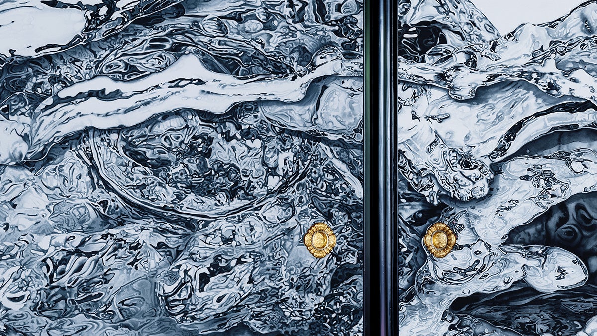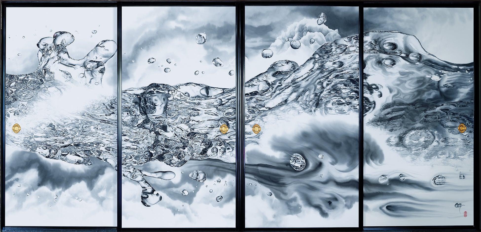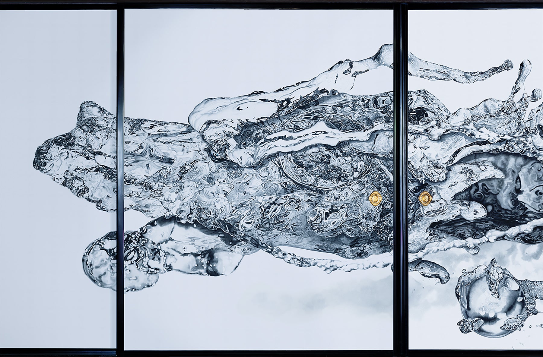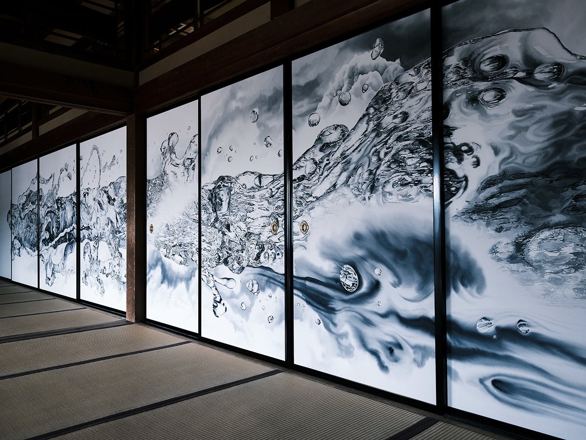 彼は水を司る神の姿を、人々に恵みを与える「清らかな水」そのもので表現したいと考え、日本の古典的な様式美を踏襲せず、類例のない、新たな様式美へと更新させました。作品右側の嵐は現在の困難な社会情勢(コロナや世界の紛争)を表現し、一方で、作品左側の空白は光を表しています。これは「全人類が明るい未来へ向かうように」という作者の願いを込めています。この襖絵は永続的に年に一期間公開される予定。100年、200年と受け継がれることでしょう。