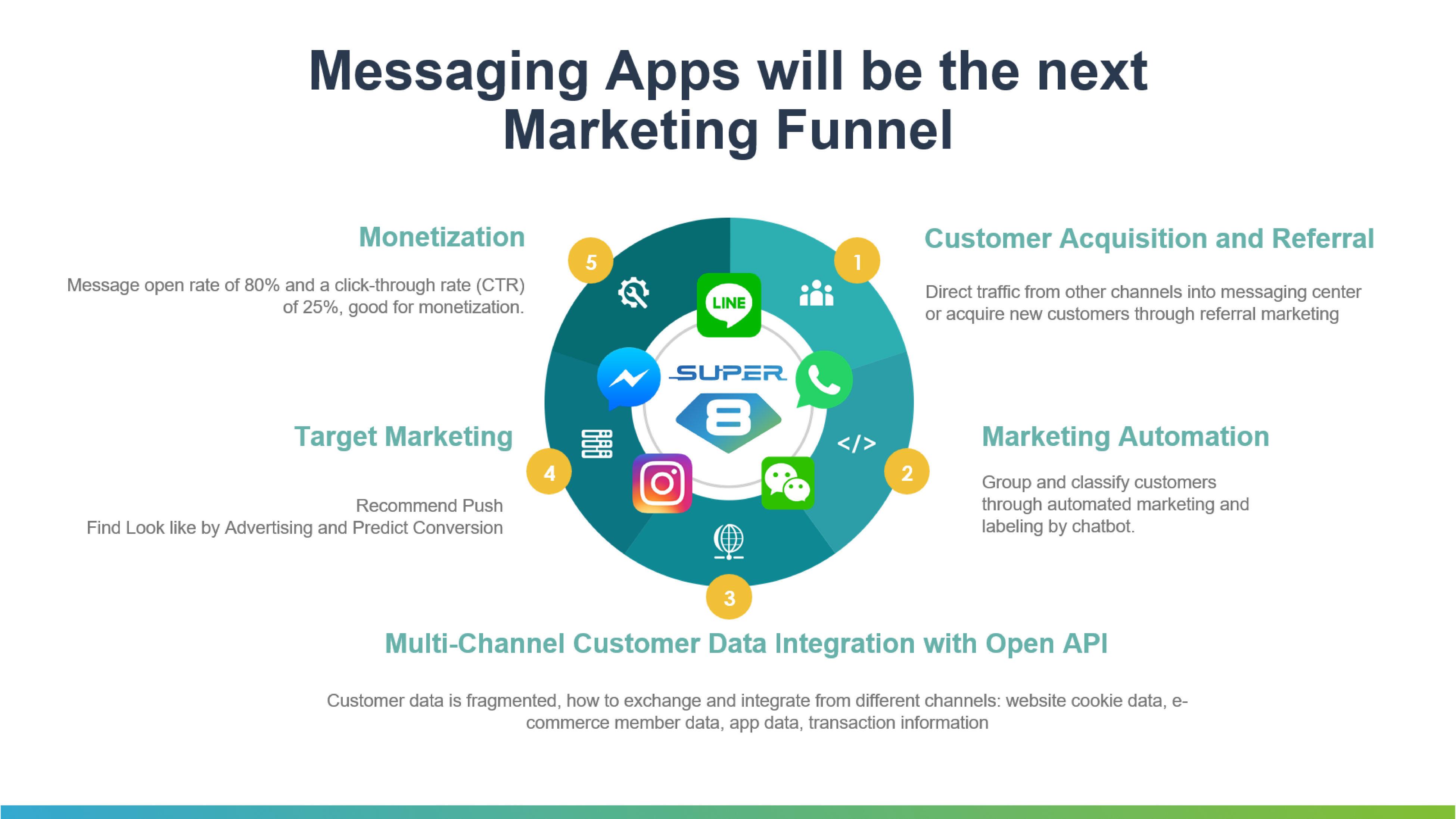 雲發互動科技有限公司の提供する「Super8」は、マーケティング施策やカスタマーサービスに活用できる、SCRM一元管理ツールです。台湾と日本のLINEはシステムが異なり、日本のLINEと連携したツールを台湾で使う事はできません。そのため「Super 8」は、台湾の現地企業のみならず、台湾進出をしている日系大手企業を含む、500社以上に導入されてきました。LINEをはじめ、Instagram、Facebook Messenger等のチャットの一元管理や、顧客の管理、公式LINEアカウントの運用などに対応しています。