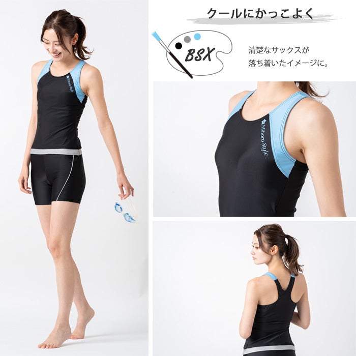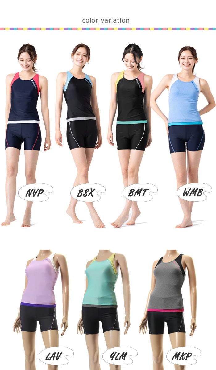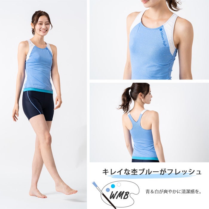 運動のしやすいように肩回りを動かしやすいタンキニで、魅力のカラーがプール通い始めに彩りを持たせています。