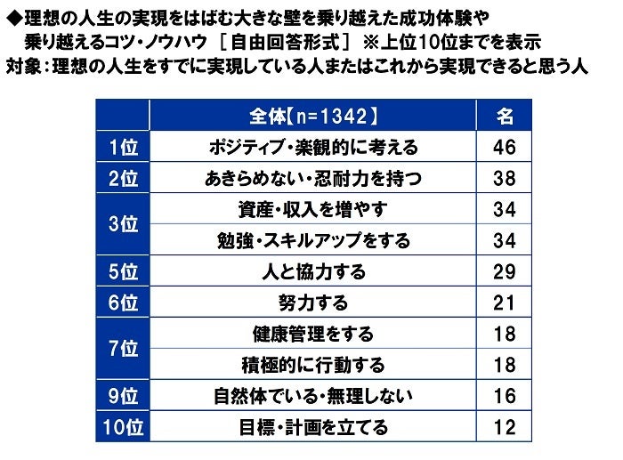 理想の人生をすでに実現している人またはこれから実現できると思う人(1,342名)に、理想の人生の実現をはばむ大きな壁を乗り越えた成功体験や乗り越えるコツ・ノウハウを聞いたところ、1位は「ポジティブ・楽観的に考える」(46名)でした。物事を前向き・楽観的にとらえ、目標を実現する原動力を失わないように意識することが大切だと考えている人が多いのではないでしょうか。次いで、2位「あきらめない・忍耐力を持つ」(38名)、3位「資産・収入を増やす」「勉強・スキルアップをする」(いずれも34名)、5位「人と協力する」(29名)となりました。