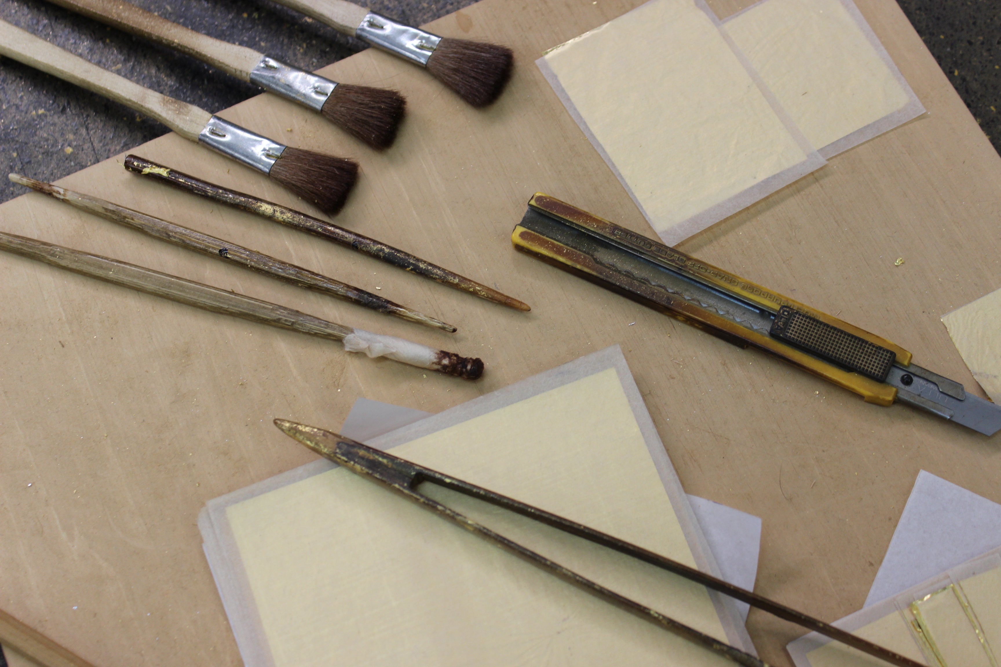 金沢が金箔生産地であり、京都は金箔押し職人の地です。鎌倉時代から道具一つ変わらず伝承されてきた技術ながら、箔押職人の数は年々減少しています。現役の工房のほとんどが一人か二人体勢で作業をする中、金箔押山村は職人の人数を確保。三代目を育成しながら他の職人も抱え、数年に何回か来る京都及び他府県の文化財の修復なども依頼される、京都内でも大手の金箔押し工房と言えます。また京都独特の「重押し」という技法にこだわり、伝承していく責任も担っています。