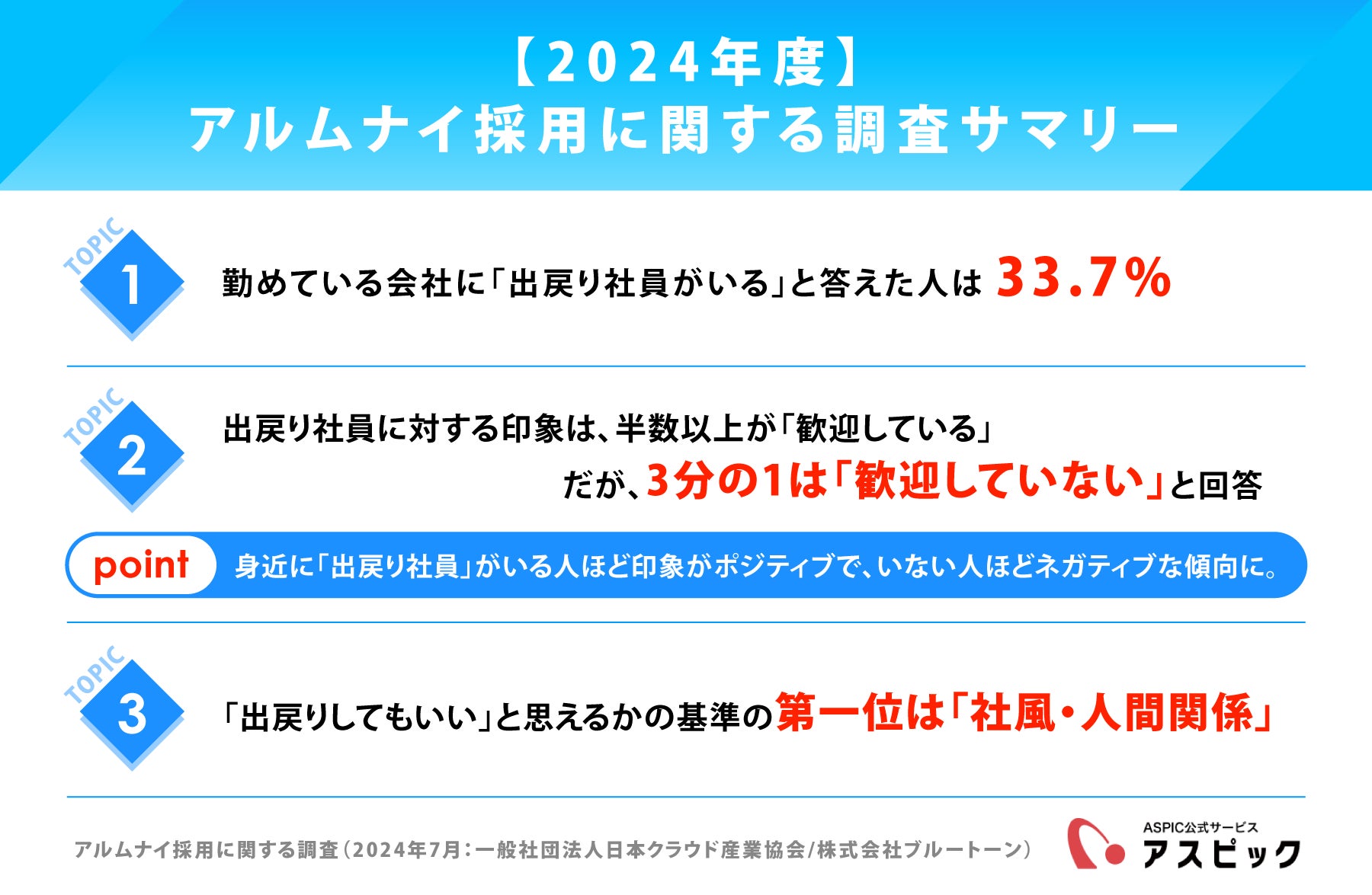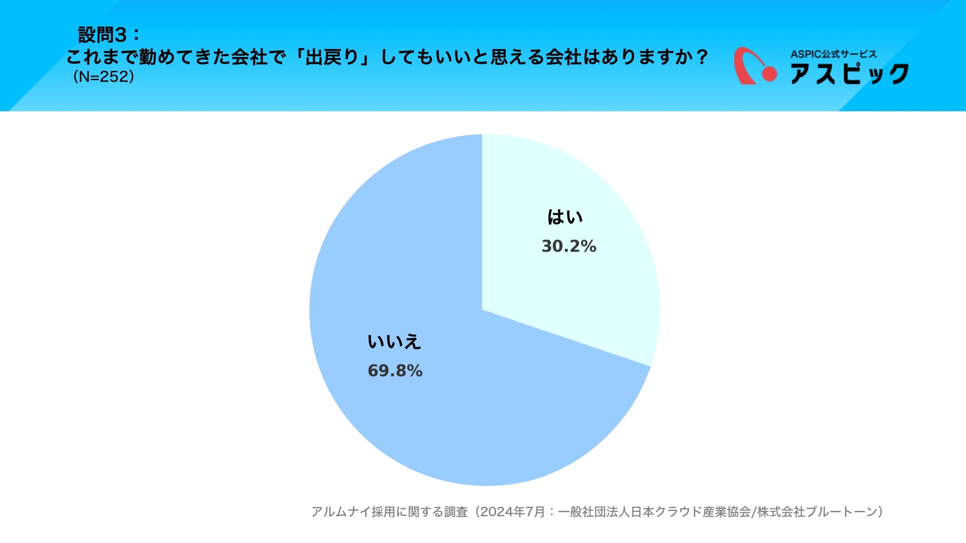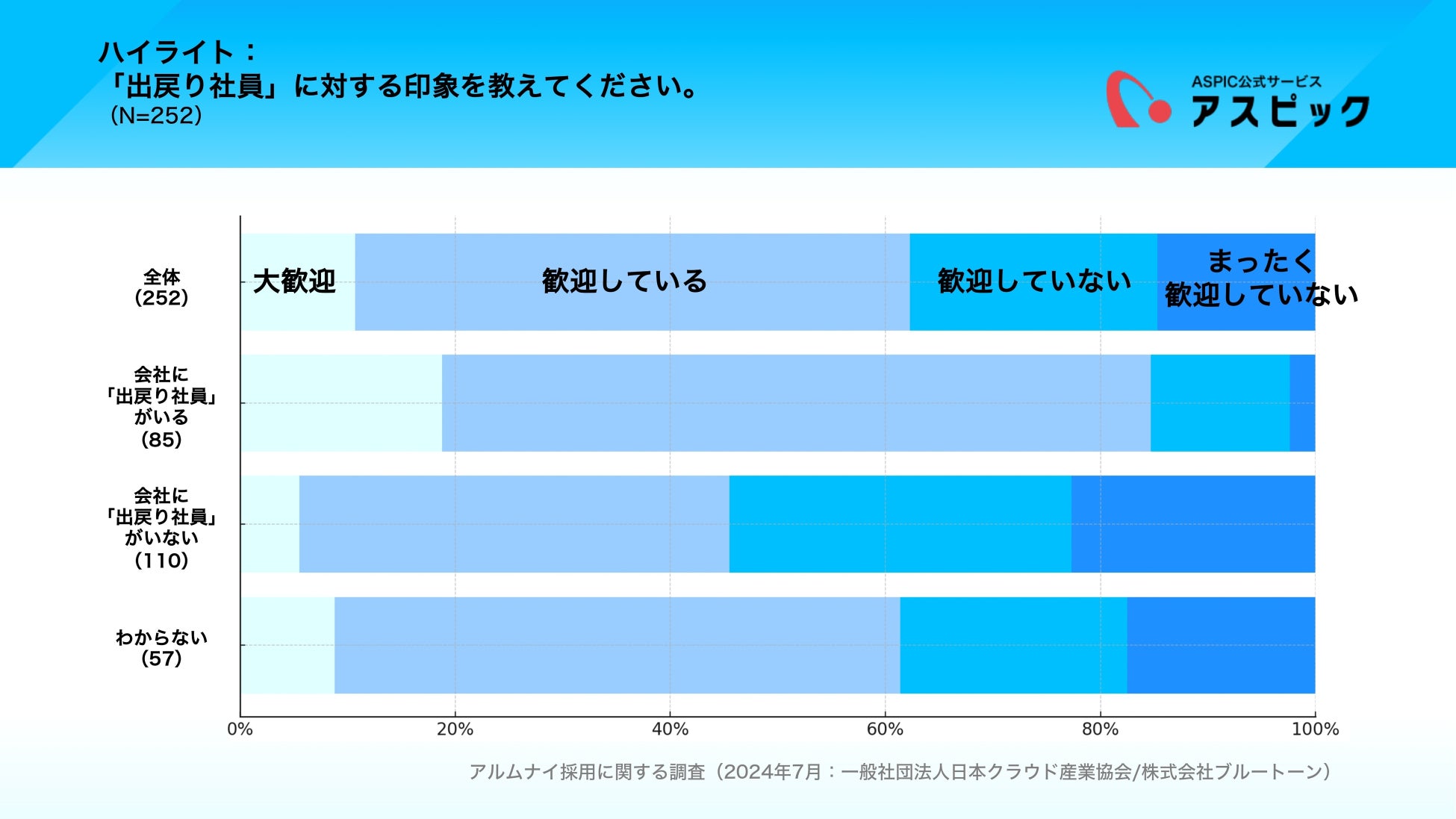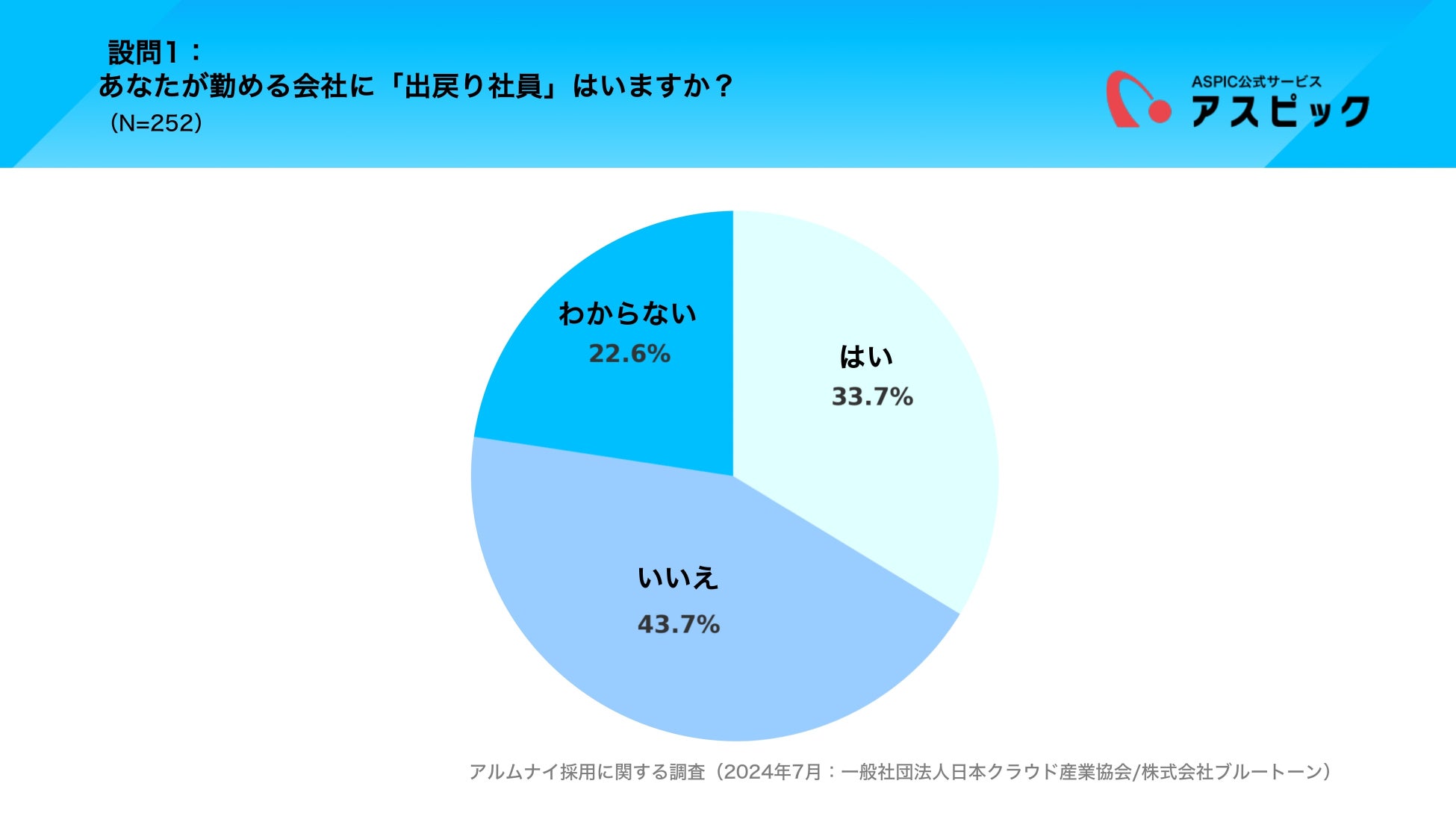 日本企業のビジネス支援に取り組む、法人向けクラウドサービス紹介サイト「アスピック」(運営:一般社団法人 日本クラウド産業協会(ASPIC)、運営委託先:株式会社ブルートーン)は、社会人の男女252人を対象に、近年注目を集めるアルムナイ(出戻り)採用についてアンケート調査を実施しましたので報告します。