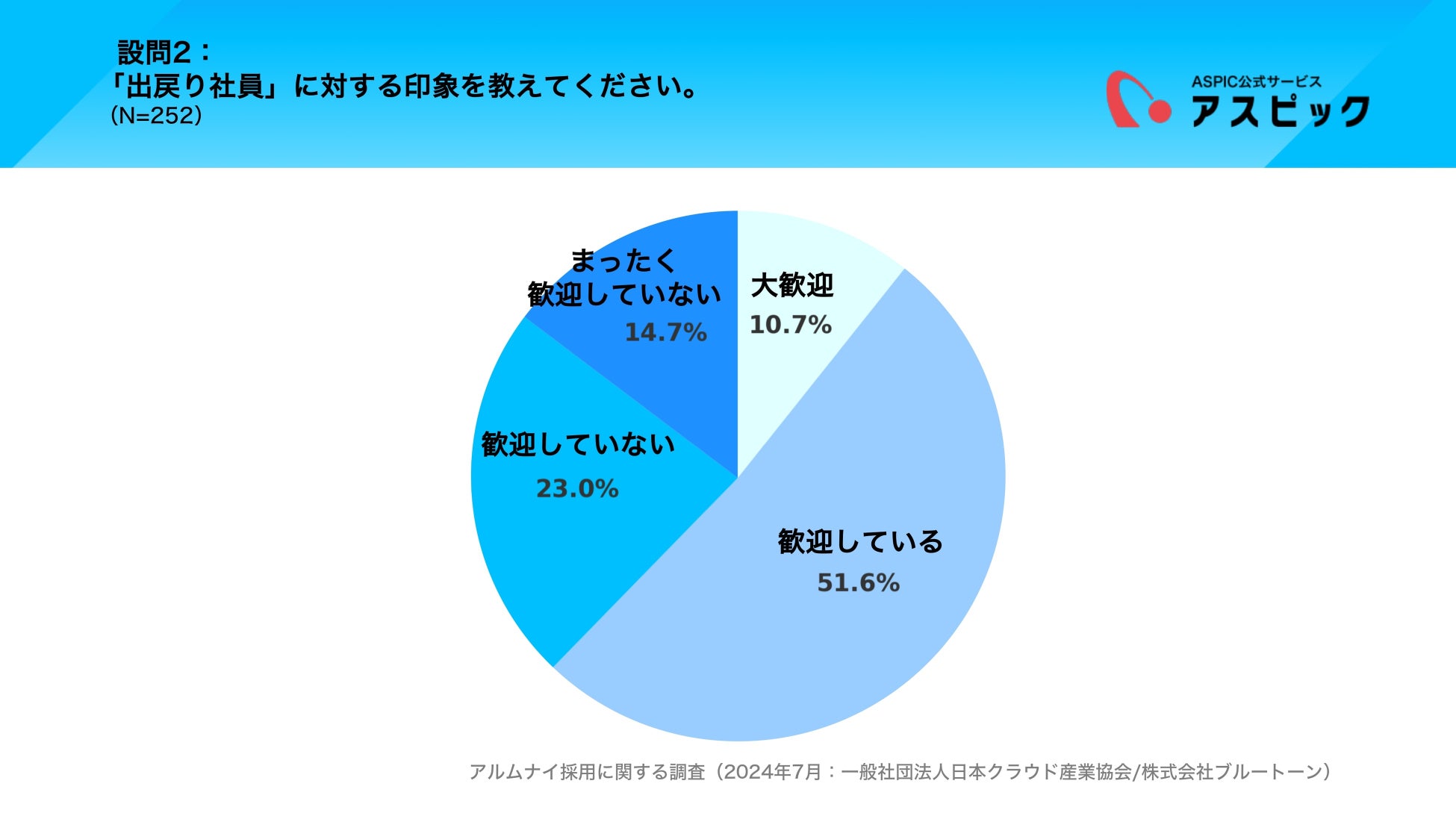 ・出戻り社員に対する印象は、半数以上が「歓迎している」だが、3分の1は「歓迎していない」と回答
