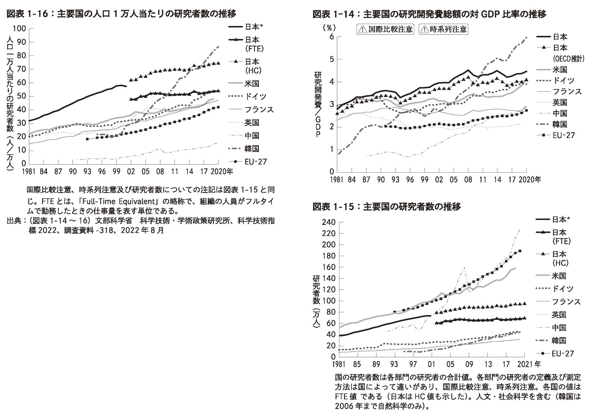 低下しているのは経済指標においてだけではない。研究開発費を見ると、日本は高い水準を維持しているものの、韓国や中国が経済規模の拡大に伴って研究開発費を増大させているのと比べると、日本の研究開発力の優位性は失われつつあるといえる。