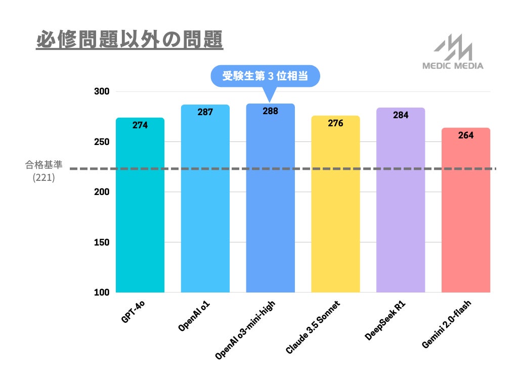 特に、OpenAI o1は必修問題で196点/200点(得点率98%)で受験生の上位5%、OpenAI o3-mini-highは必修問題以外の問題で288点/300点(得点率96%)で受験生中第3位を記録し、いずれもトップレベル受験生並みの成績でした。