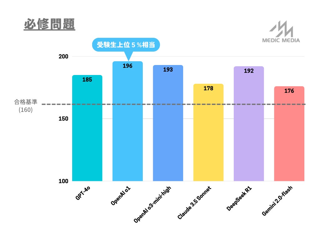 株式会社メディックメディア(代表取締役社長:岡庭 豊)は、近年発展が著しい生成AIサービスが医療分野でも診断補助や教育活用への期待を集める中、2025年2月8、9日に行われた第119回医師国家試験の問題を、複数のAIモデルに解かせてその実力を検証しました。その結果についてご報告します。
