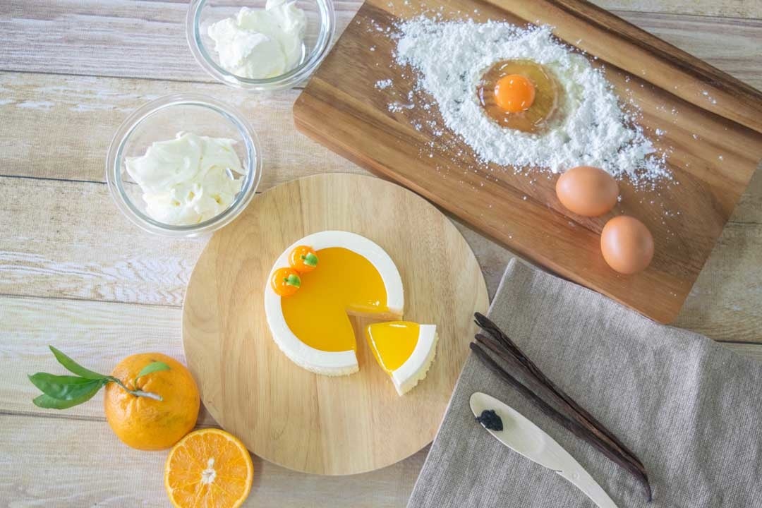 もぎたてたんかん、読谷村産バニラ、ケージフリーの卵、高級クリームチーズ、マスカルポーネチーズを使用したこだわりの新しいチーズケーキを作りました。