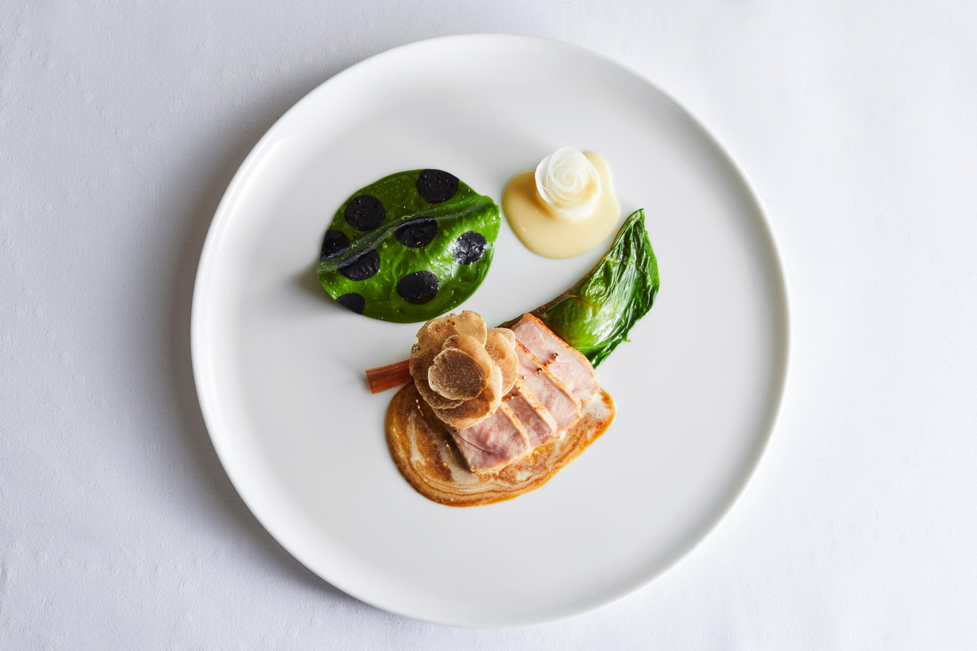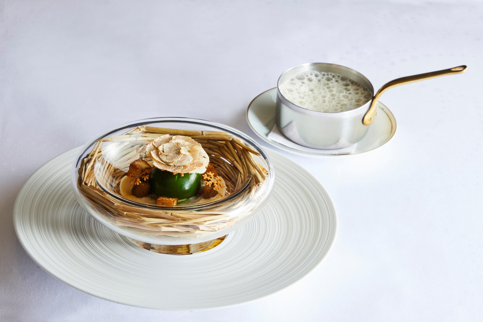 クリーミーな黒と緑のラビオリ、白トリュフのラペ、ジュマルブレ