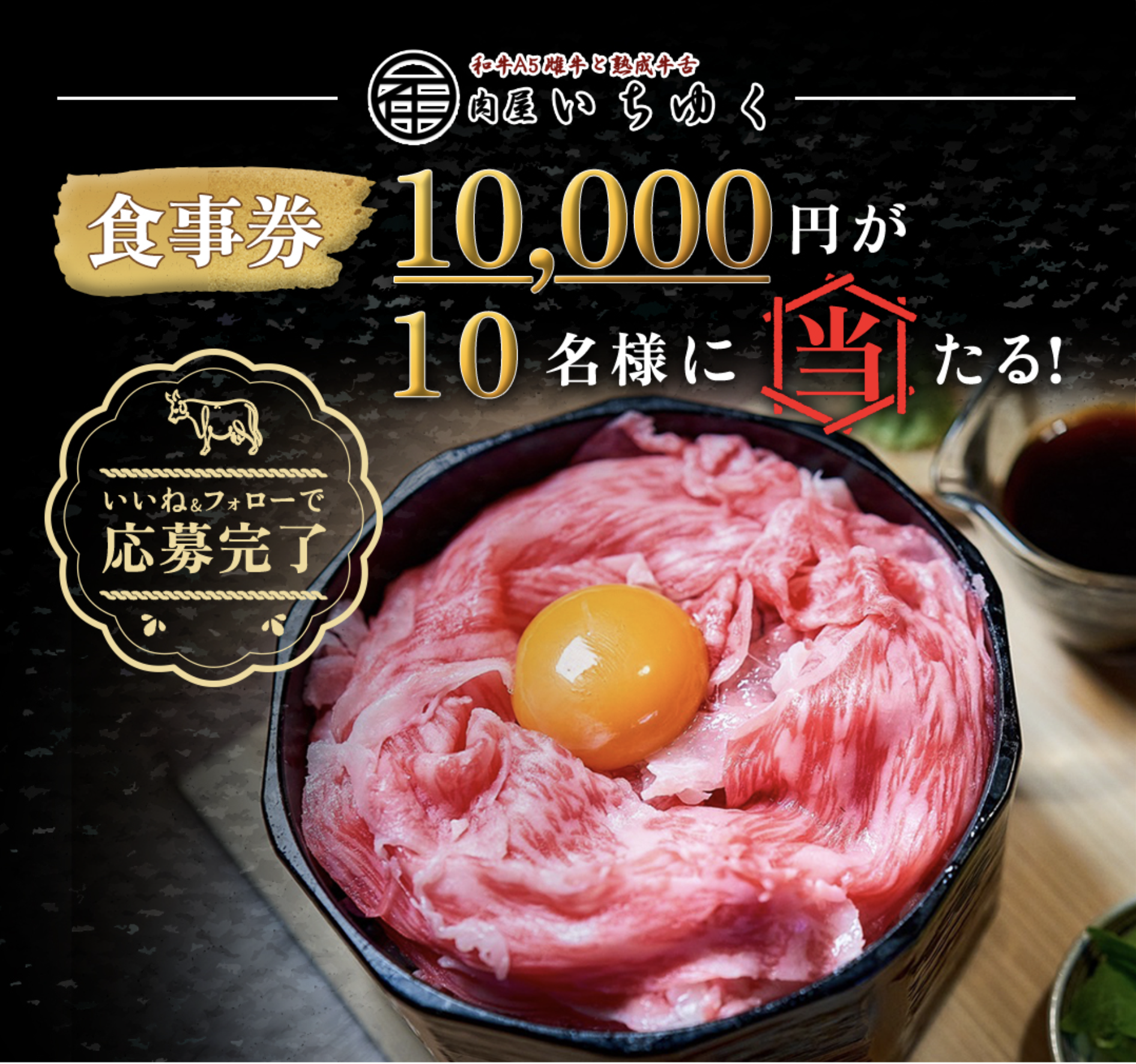 和牛A5雌牛と熟成牛舌 肉屋いちゆくでは、日頃のご愛顧に感謝して抽選で10名様にお食事券1万円が当たるキャンペーンを実施中!