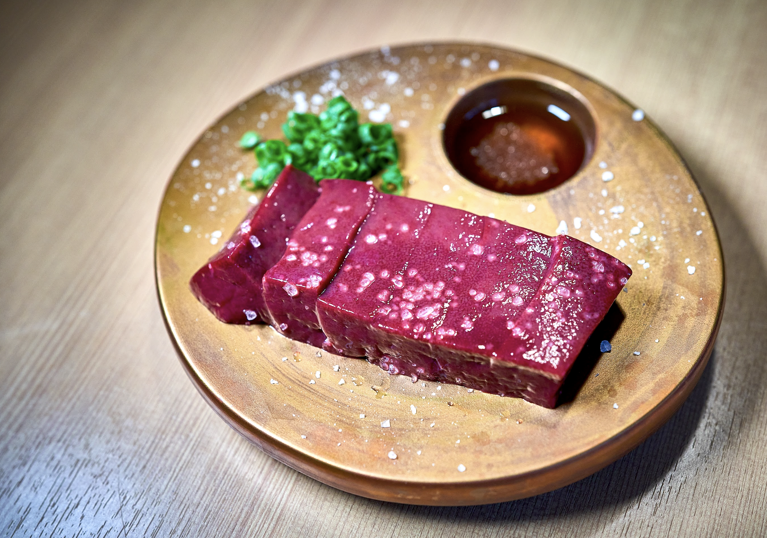 新鮮なレバーのいい部分を厚切りにし、陶板で表面を軽く焼いただけでお召し上がり頂けます。