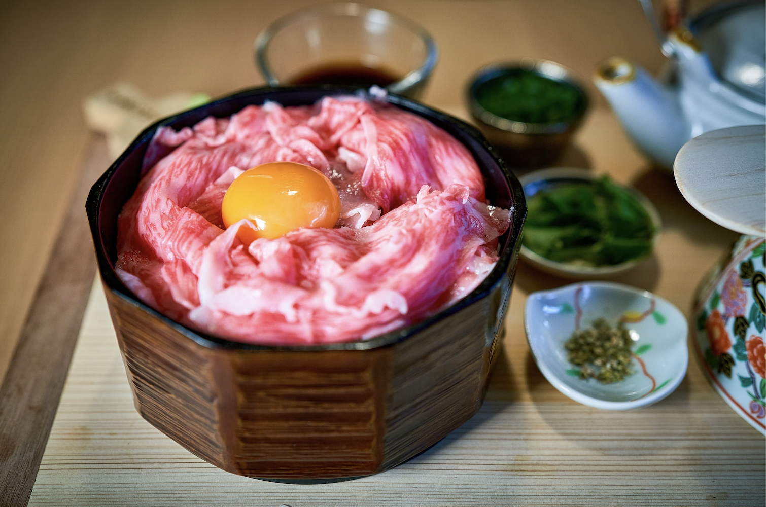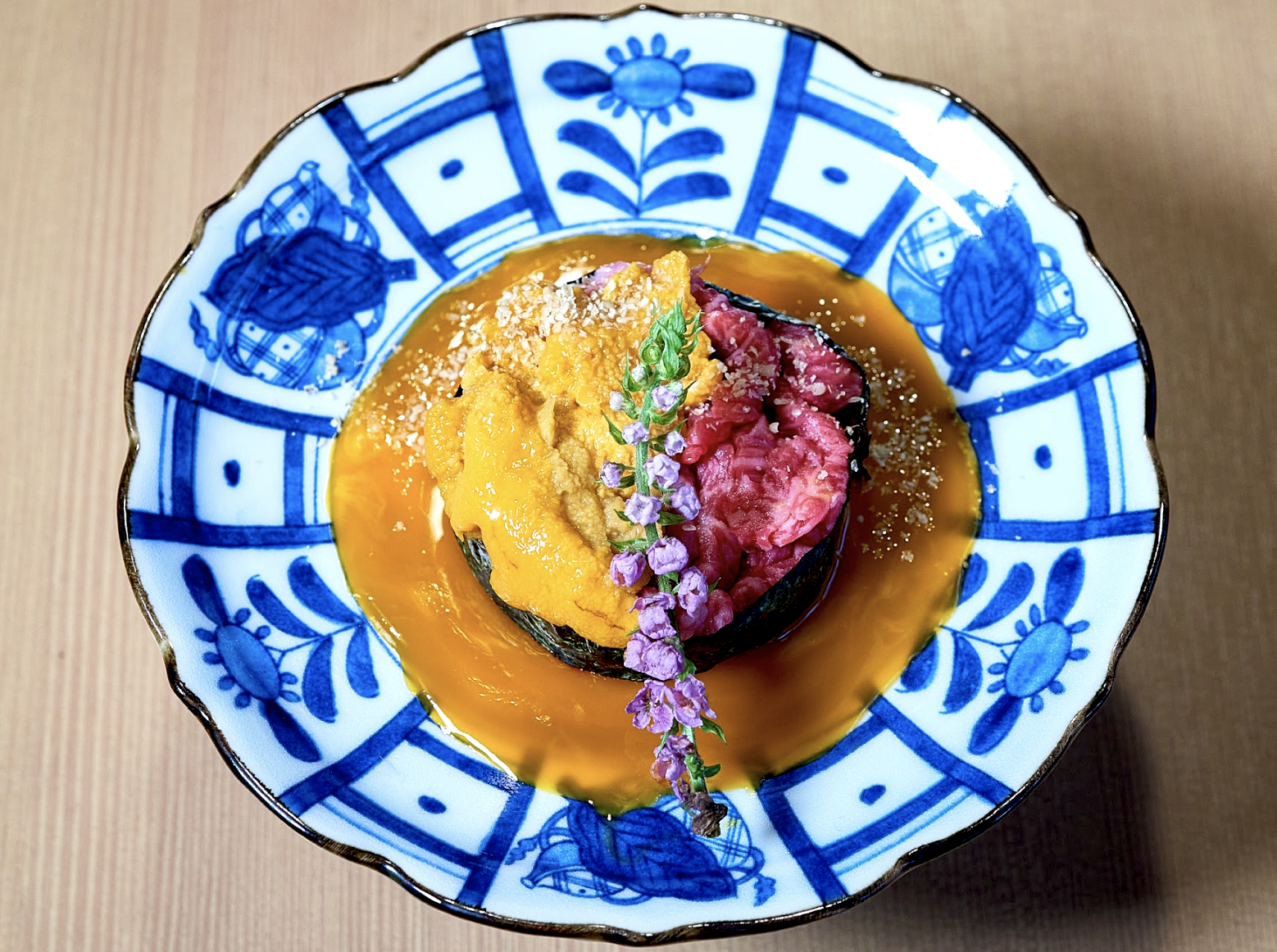 雲丹と和牛A5雌牛をコラボさせた贅沢な一品。お肉と雲丹を下に敷いた卵黄に絡めてお召し上がりください。口の中でとろける濃厚な味わいが楽しめます。