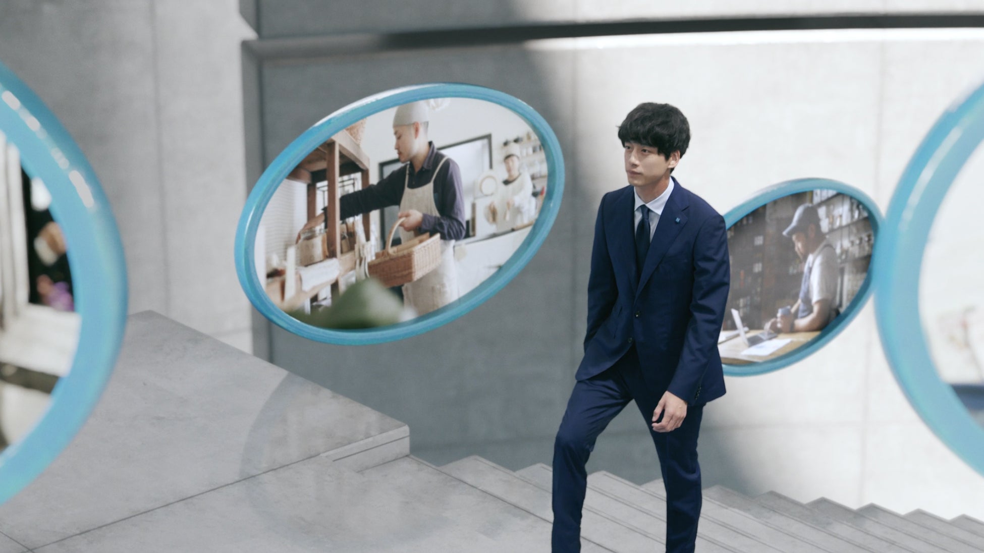 そんな様子をひとつひとつ見守りつつ、坂口さんが階段をかけ上がっていくと、屋上で中小企業の方々や信用金庫の職員と出会います。信用金庫とともに、中小企業の課題を解決する坂口さん。最後には全員が同じ方向を目指し、「日本の原動力を前へ。」のキャッチコピーとともに、明るい未来を見据えるストーリーとなっています。