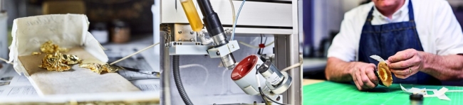 技術習得の後、エンジニア達は、生産効率を上げるため、生産加工技術を模索しました。しかし、ゴールドコーティングにおいて、テクノロジーはあくまで補助的な役割でしかなく、手作業の伝統技術に代わるものがないことを学んだのです。