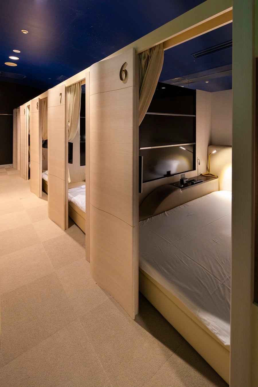 天井近くまで仕切りのある半個室タイプのお部屋でゆっくりおやすみ頂けるレディースプレミアムルームを新設致しました。半個室タイプなので、広々としたマットレスを周りを気にせずご利用頂けます。