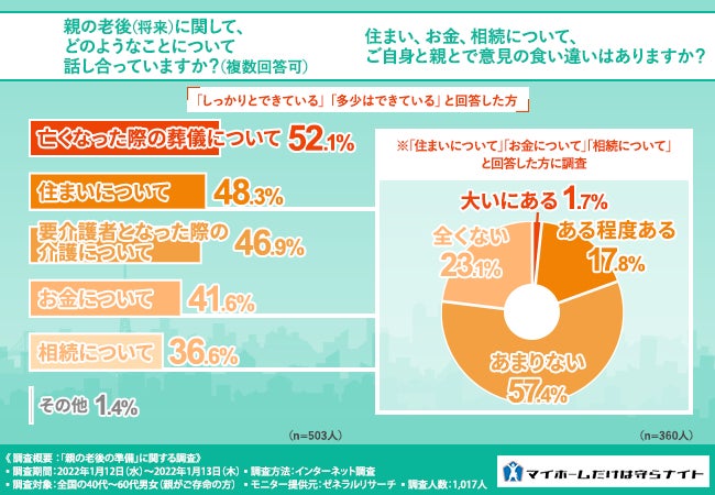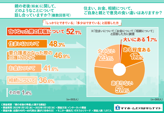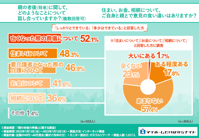 前回の質問で、『住まいについて』『お金について』『相続について』と回答した方に、「住まい、お金、相続について、ご自身と親とで意見の食い違いはありますか?」と質問したところ、『大いにある(1.7%)』『ある程度ある(17.8%)』『あまりない(57.4%)』『全くない(23.1%)』と回答しました。