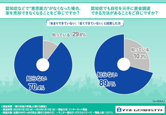 そこで、「認知症などで“意思能力”がなくなった場合、家を売却できなくなることをご存じですか?」と質問したところ、7割の方が『知らない(70.4%)』と回答しました。