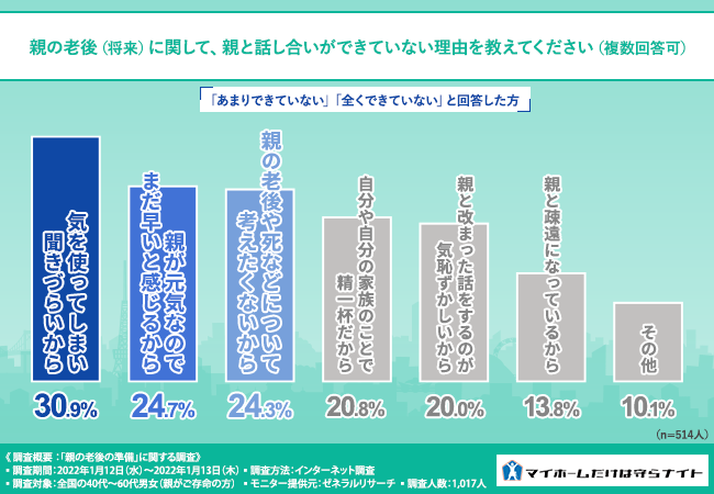 「親の老後(将来)に関して、親と話し合いができていない理由を教えてください(複数回答可)」と質問したところ、『気を使ってしまい聞きづらいから(30.9%)』と回答した方が最も多く、次いで『親が元気なのでまだ早いと感じるから(24.7%)』『親の老後や死などについて考えたくないから(24.3%)』と続きました。