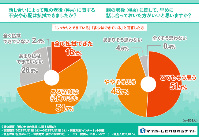 そこで、「話し合いによって親の老後(将来)に関する不安や心配は払拭できましたか?」と質問したところ、7割の方が『全て払拭できた(16.1%)』『ある程度は払拭できた(今後さらに話し合いの余地はある)(54.7%)』と回答しました。