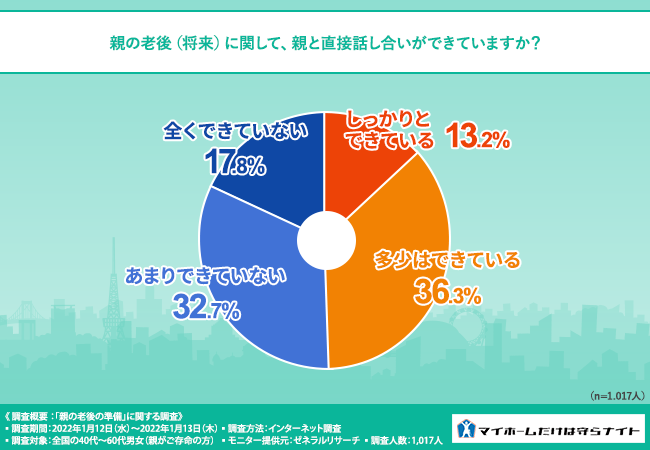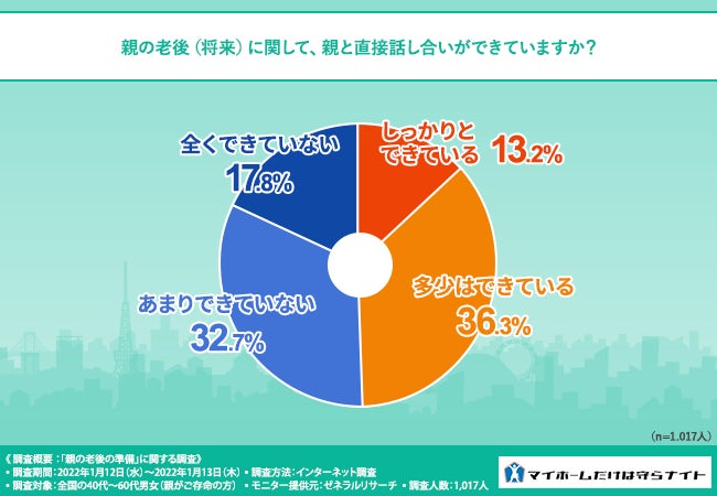 「親の老後(将来)に関して、親と直接話し合いができていますか?」と質問したところ、『多少はできている(36.3%)』と回答した方が最も多く、次いで『あまりできていない(32.7%)』『全くできていない(17.8%)』『しっかりとできている(13.2%)』と続きました。
