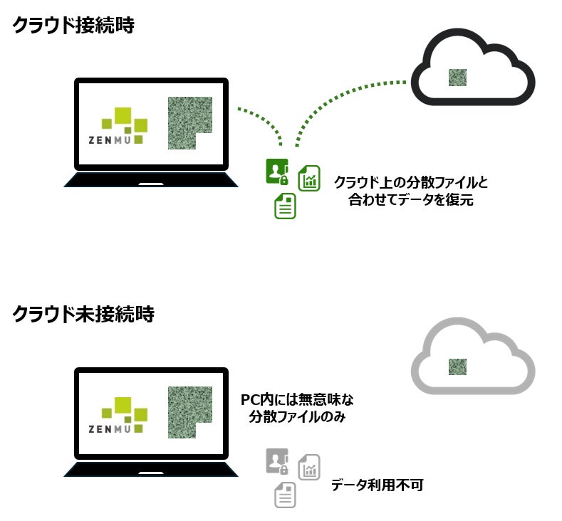 ZEEは、当社独自の秘密分散技術でPC内のデータを無意味化して分割し、PC内とクラウドまたはスマートフォン等に別々に分散管理します。PC内のユーザーデータを意味のない形に変えて分割し、「PC」と「クラウドまたはスマートフォン等」に別々に分散保管します。未接続の状態ではデータが復元されず、また、管理者が遠隔でロックすることでPC内へのデータアクセスを不能な状態になるため、PCからの情報漏えいリスクを低減します。