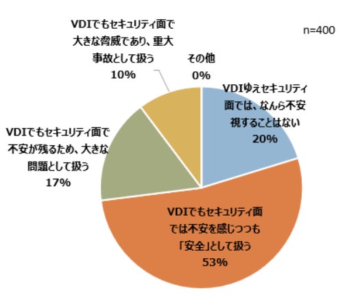 別の調査(*2)でも、「VDI環境にあるPC盗難紛失時の認識」に関して、「VDIゆえセキュリティ面では、なんら不安視することはない」と回答したのは2割にとどまっており、8割の企業は、盗難・紛失時のセキュリティに不安を感じています。(Fig.1)