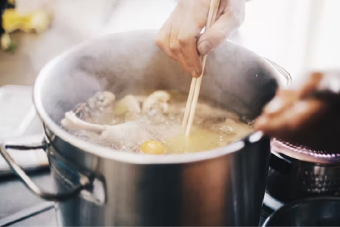 埼玉県小川町にある養鶏場「ぶくぶく農園」。国産の穀類や無農薬野菜など栄養満点のエサを食べ、広い敷地でのびのびと育った鶏達はいずれ卵を産まなくなると養鶏は引退。大切に育てた命だから最後まで大切に扱いたい。筋肉質で旨味成分を多く含む親鶏の骨の鶏ガラスープは料理の味を力強く下支えします。
