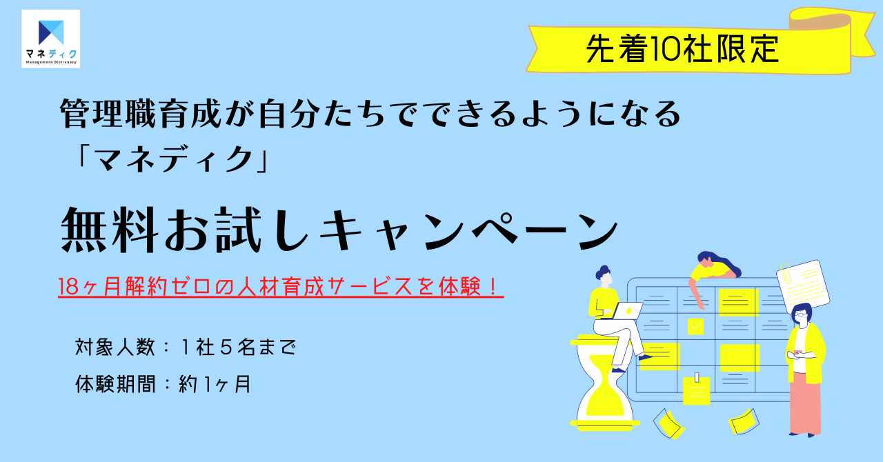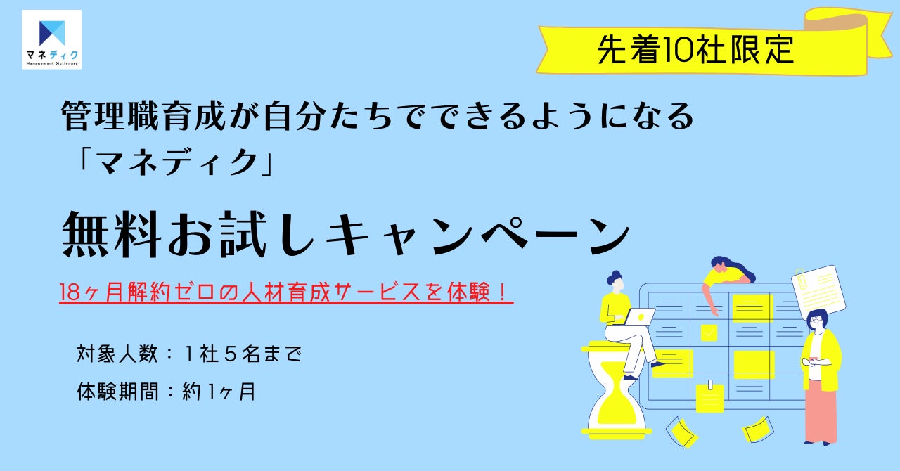 今回、マネディクの一番の特徴である「自社でずっと続けられる管理職育成サイクル」の一端を実際に経験いただけるよう、10社限定の無料お試しキャンペーンを実施します。
