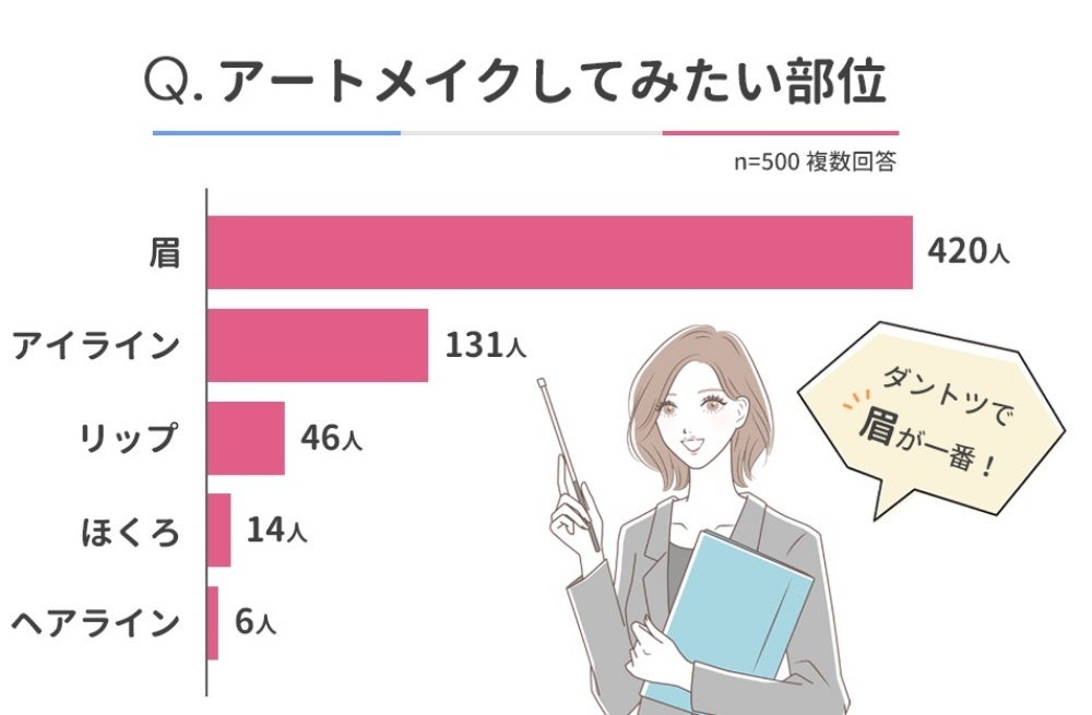 アートメイクに興味がある女性500人に「アートメイクしてみたい部位」を聞いたところ、ダントツの1位は「眉(420人)」でした。