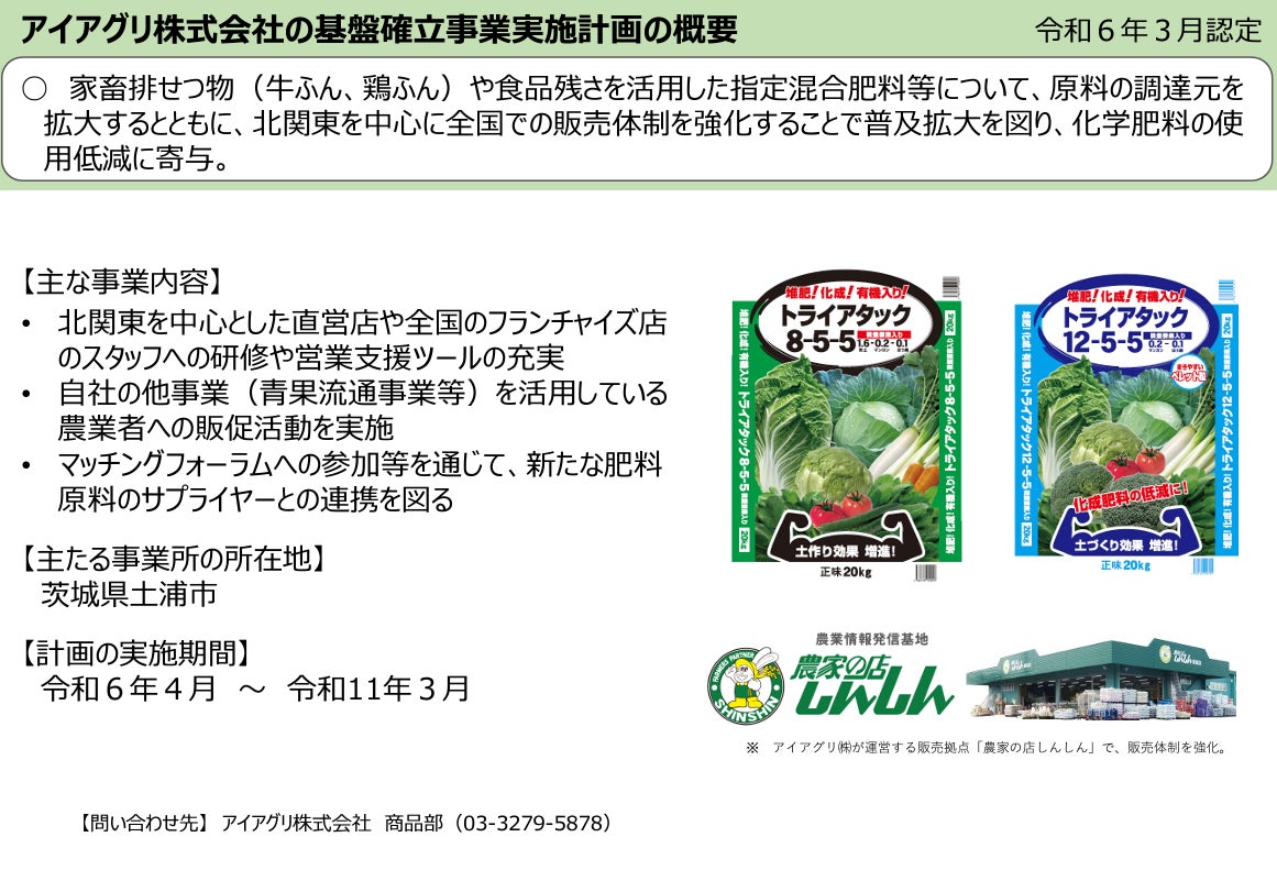 アイアグリ株式会社、みどりの食料システム法に基づく基盤確立事業実施計画の認定を取得。農業資材販売店の強みを活かし、家畜排せつ物(牛ふん、鶏ふん)や食品残さを活用した指定混合肥料等の普及拡大を図る。