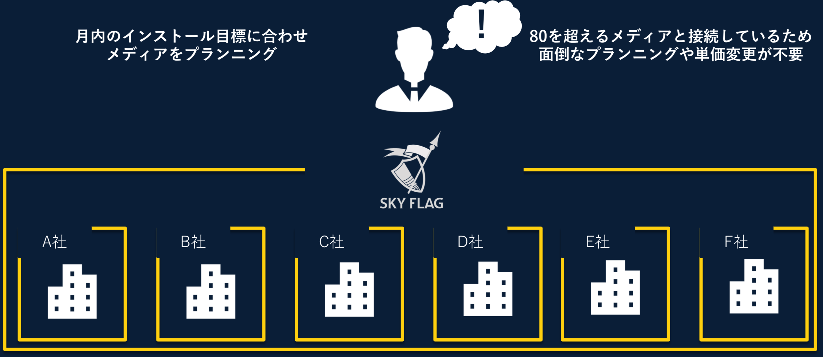 従来、成果報酬型の広告を実施する際、各インターネットメディアへの発注や成果報酬単価の調整、運用が必要でしたが、SKYFLAGでは80を超えるインターネットメディアと連携しており、上記の運用を一元管理することが可能です。