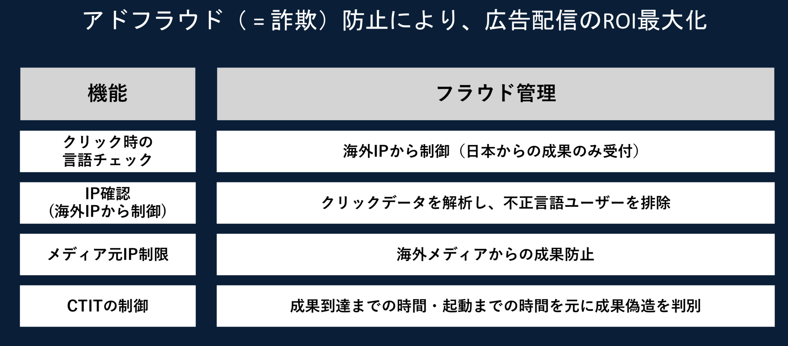 成果報酬型広告で発生するアドフラウドの防止・検知ができる機能を搭載しており、安全に広告出稿が行えるよう