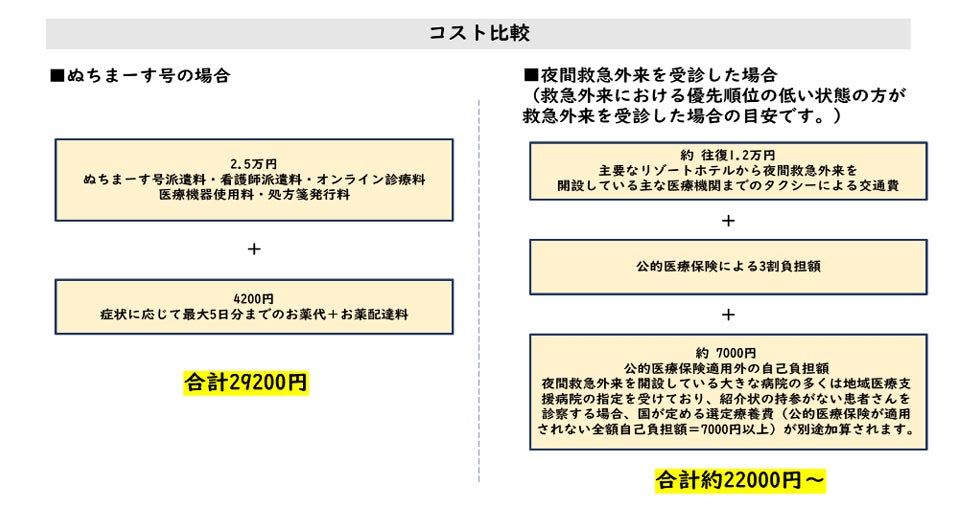 本国における持続可能な医療体制の維持を考え、旅行中における救急外来で優先順位が比較的低い状態における夜間・深夜時間帯の利便性の高い医療サービスについては公的医療保険での負担ではなく自由診療(全額自己負担)でも選択肢になるのではないかと考えました。そこでぬちまーす号での DtoPwithN での診療およびお薬代・配達代を合わせ29,200円といたしました。海外からの来沖者については言語対応等が必要となるため夜間帯500米国ドル、深夜帯800米国ドルでサービスを提供します。