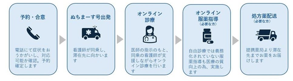 看護師とドライバーが「ぬちまーす号」でお客様の滞在先に向かいます。医師の指示のもと、患者と看護師が一緒に遠隔でオンライン診療を行い、必要に応じて薬を処方します。