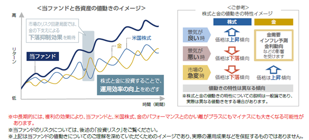 米国株式への投資では、「インデックス マザーファンド 米国株式」、米国の株価指数先物取引に係る権利を主要投資対象とし、米国の金融商品取引所に上場している企業のうち、時価総額や流動性、業種のバランスなどを勘案して選ばれた500社の株式で構成される株価指数「S&P500指数」に連動する投資成果をめざします。金への投資では、金先物取引に係る権利を主要投資対象とします。先物を活用することにより、純資産総額に対して、両者合わせて約200%の投資を行なうことを可能にします。また値動きの特性が異なる株式と金を組み合わせることで、運用効率の向上が期待できるほか、市場でリスク回避の動きが強まる局面では金が強みを発揮し、ファンド全体の下値を抑制することが期待されます。