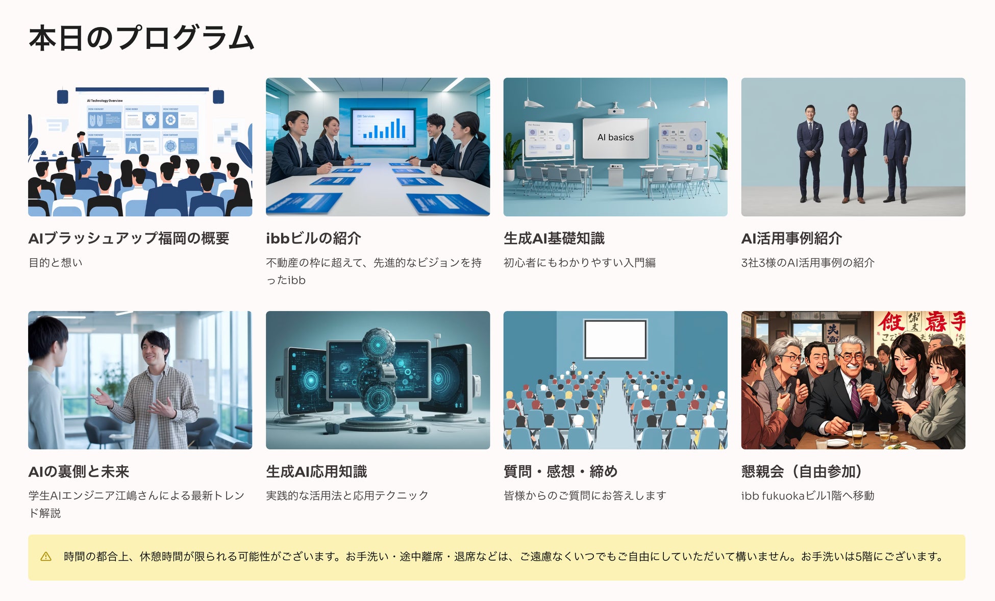 昨年9月に福岡市中央区天神ibb fukuokaビルで開始した「経営者向け生成AI勉強会」では、福岡・佐賀・山口・宮崎・沖縄などから延べ100名以上が参加、満足度92%を記録(AIブラッシュアップ福岡調べ)。