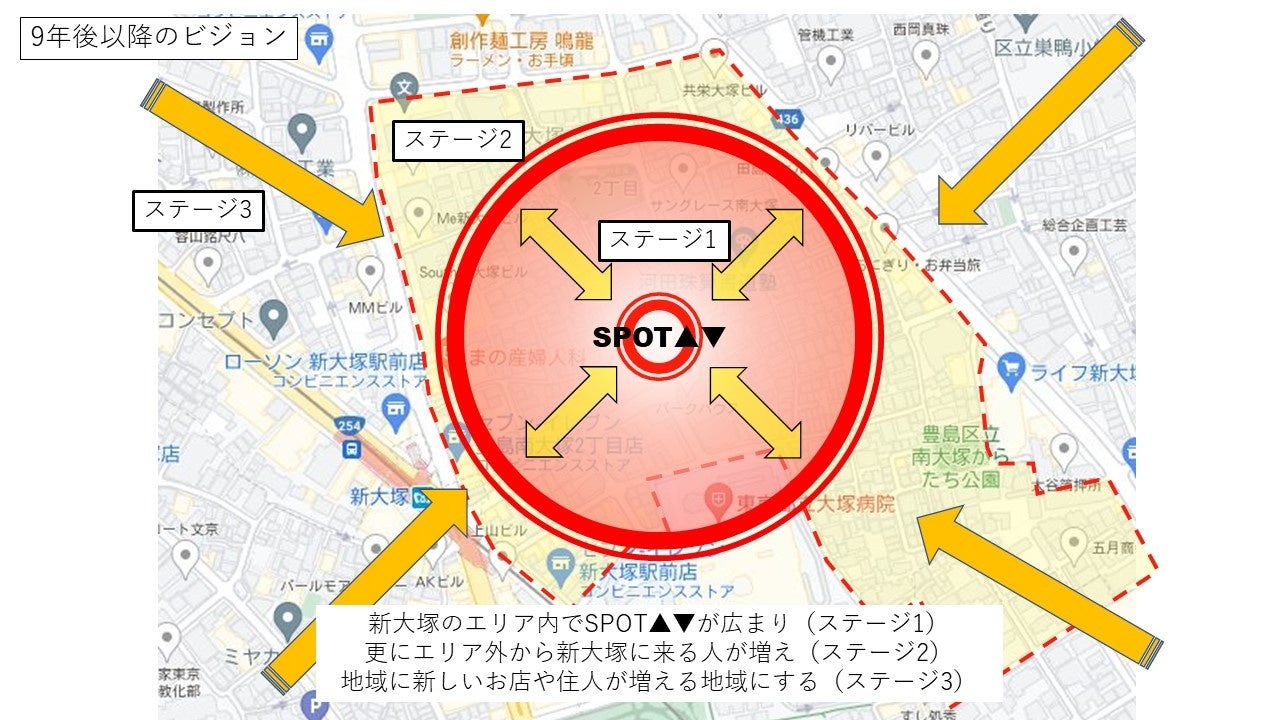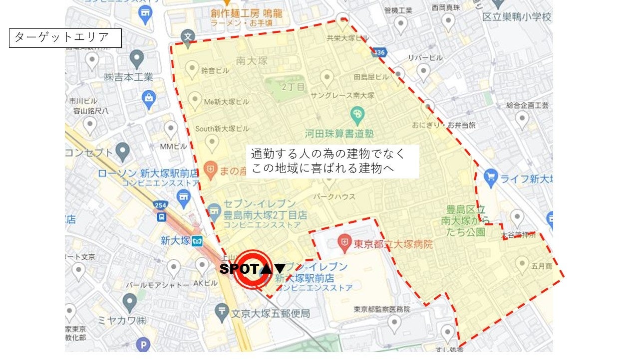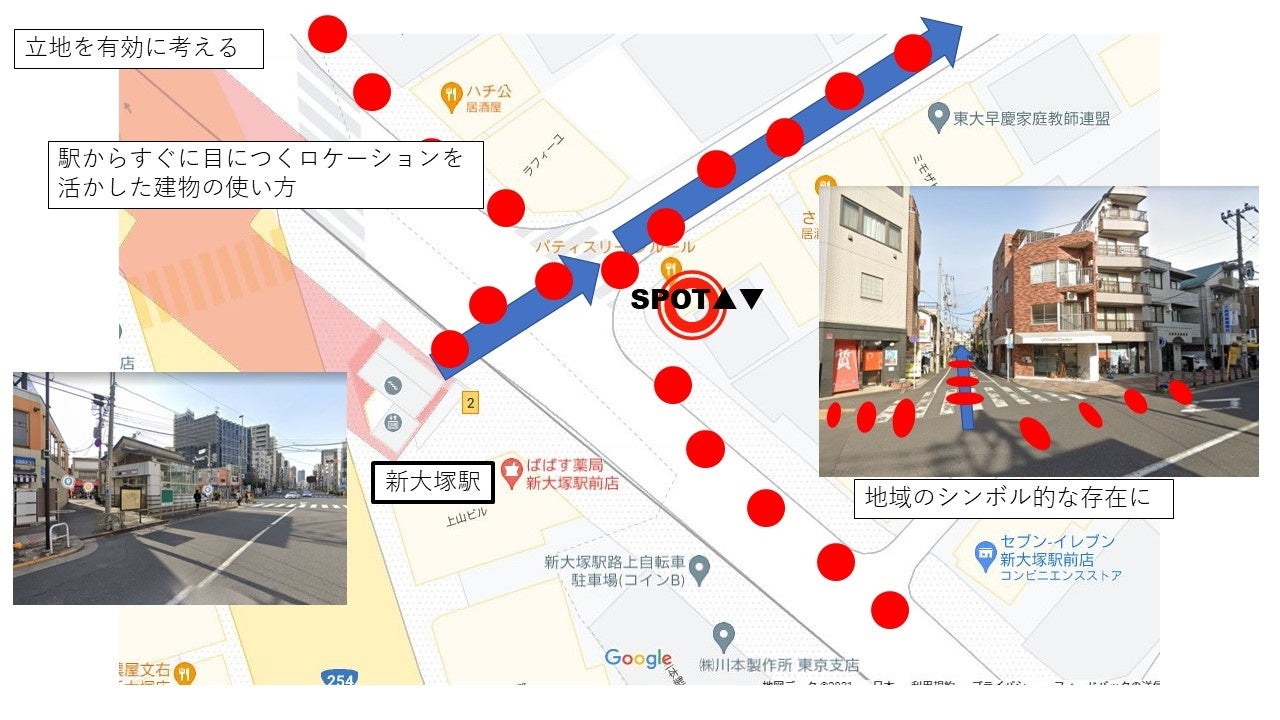 駅からもう目の前に見えるこの建物がこれからの地域が良くなるような場所(スポット)となるようにそのような願いを込めて「SPOT新大塚」と名付けました。