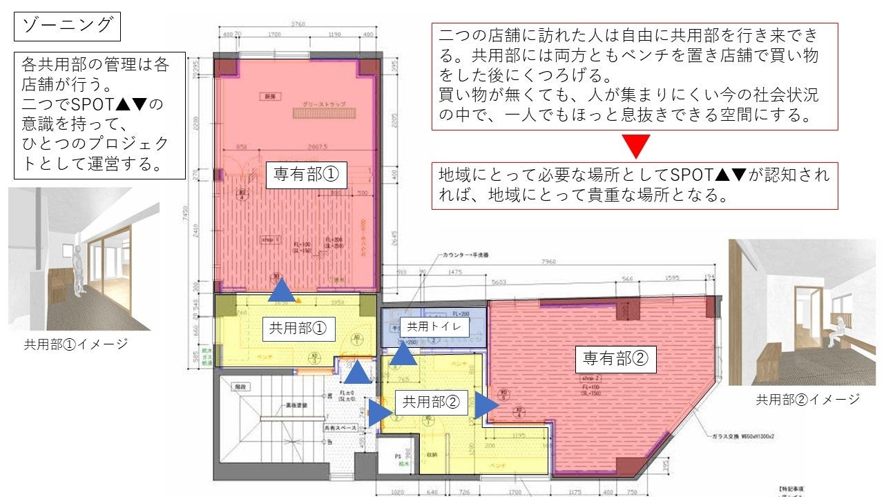 2つの専有部分(軽飲食+小売り物販)と2つの共用部分をワンフロアで運営するコミュニティ型店舗