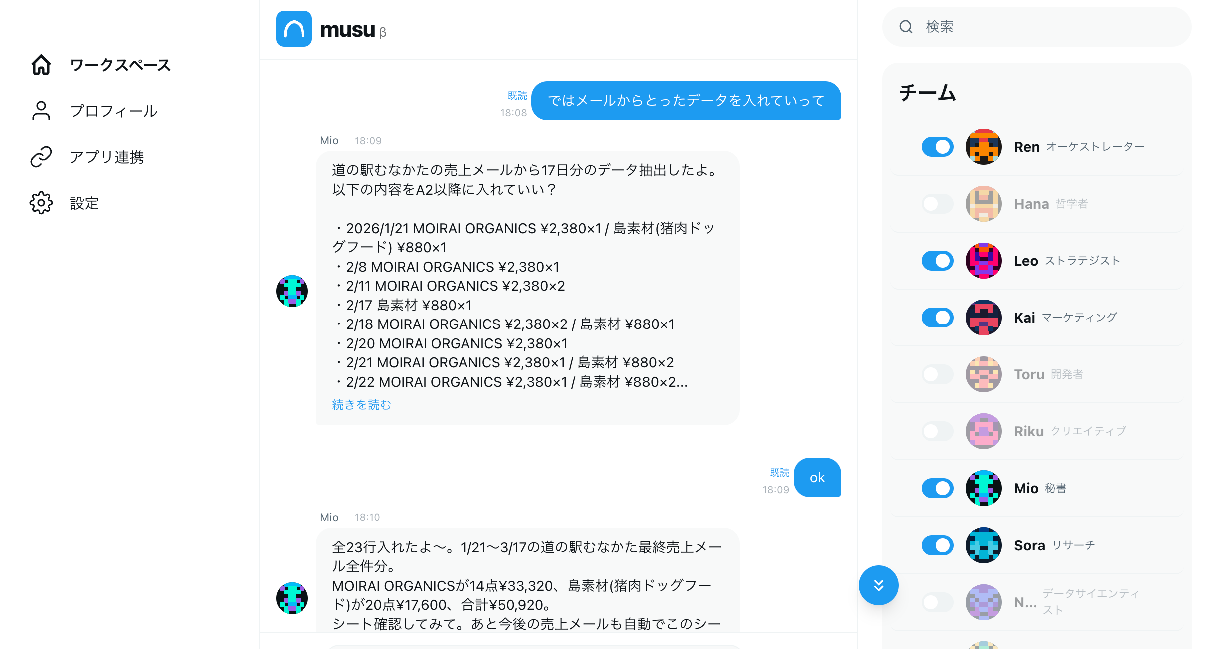 musuは、それぞれ専門分野を持つ複数のAIエージェントが「チーム」として連携し、ユーザーの事業をサポートするAIワークスペースです。エージェント数は無制限。チャット形式で話しかけるだけで、最適な担当エージェントが自動的に割り振られ、リサーチ・メール作成・SNS投稿・スケジュール確認などの業務を実行します。