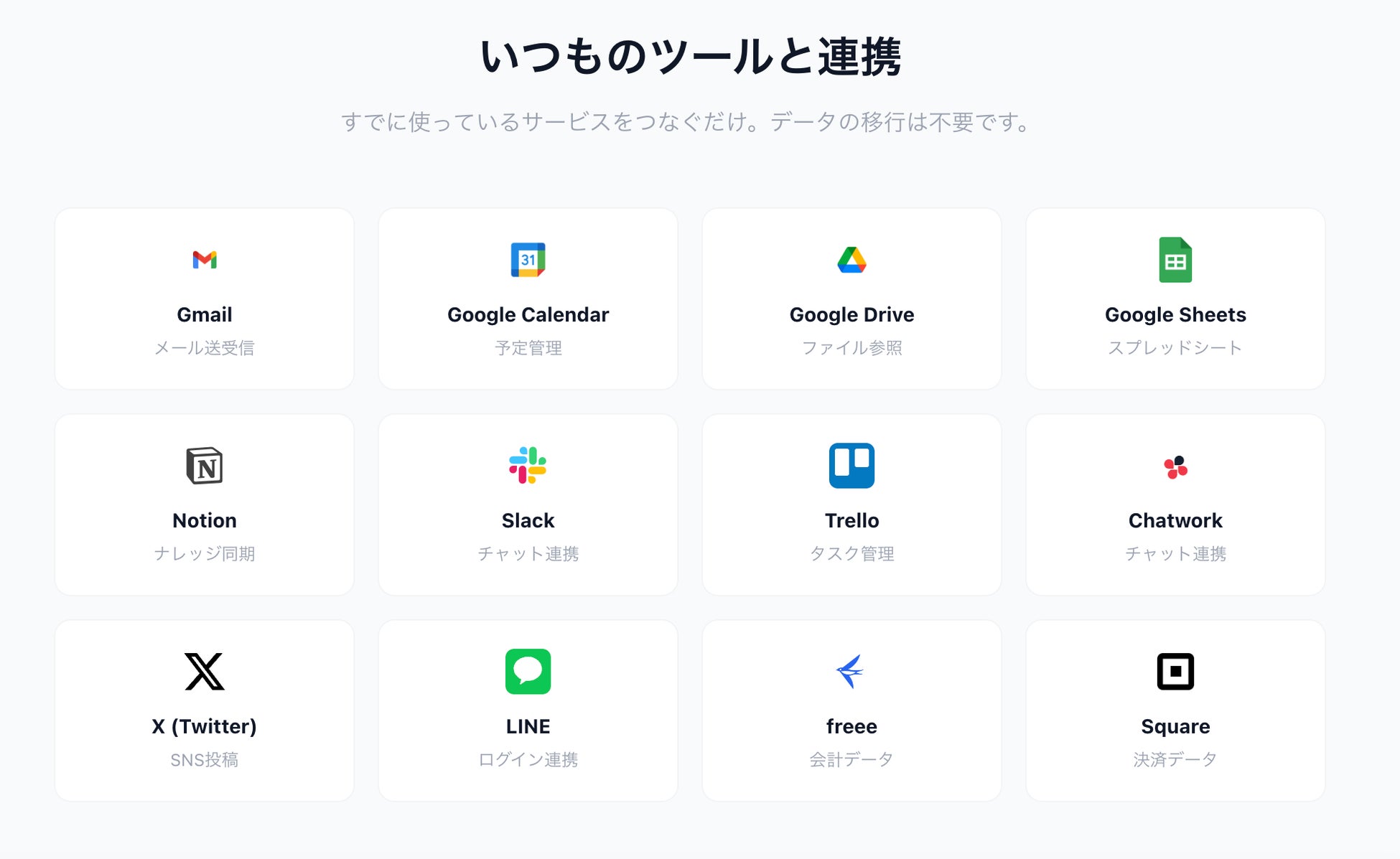 Gmail / Googleカレンダー / Google Drive / Notion / Slack / Trello / X(旧Twitter)/ LINE 等、随時連携先の数を増やしていく予定です。