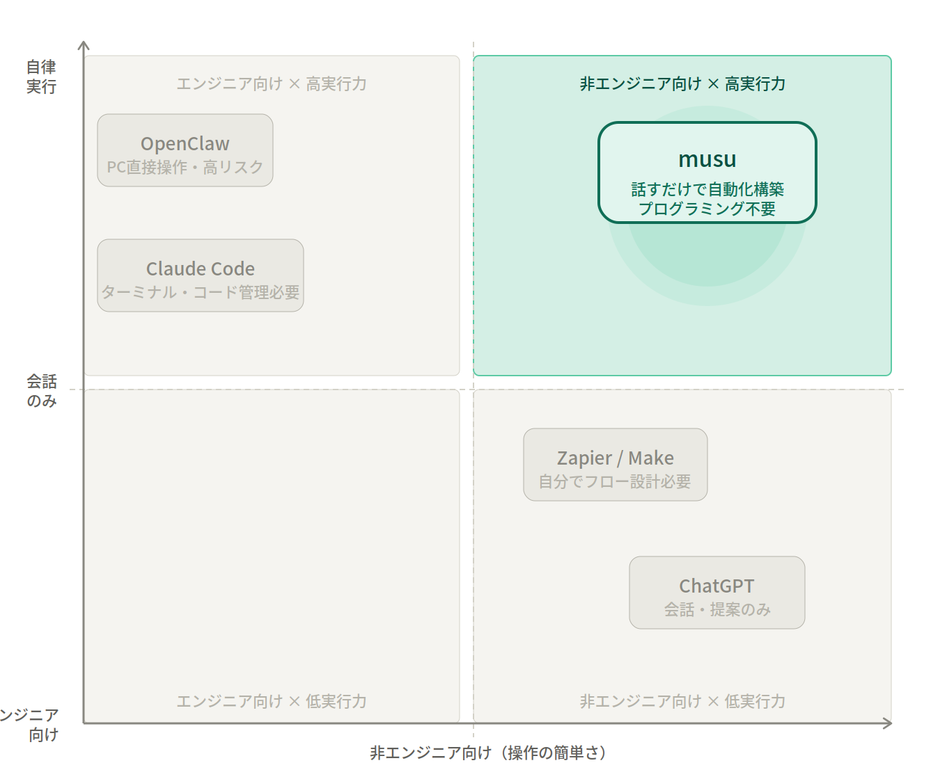 Claude CodeやOpen Clawがエンジニアや技術習熟者向けであるのに対し、musuは「ITの知識ゼロ・設計不要・話すだけ」をゴールに設計されています。