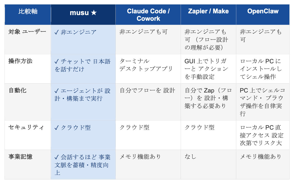musuは、既存の自動化・AIエージェントツールとは明確に異なる立ち位置にあります。